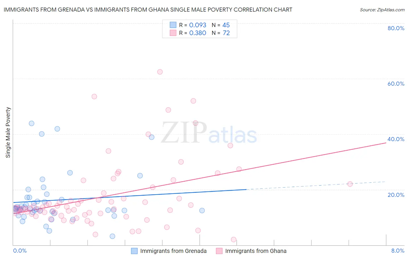 Immigrants from Grenada vs Immigrants from Ghana Single Male Poverty Correlation Chart