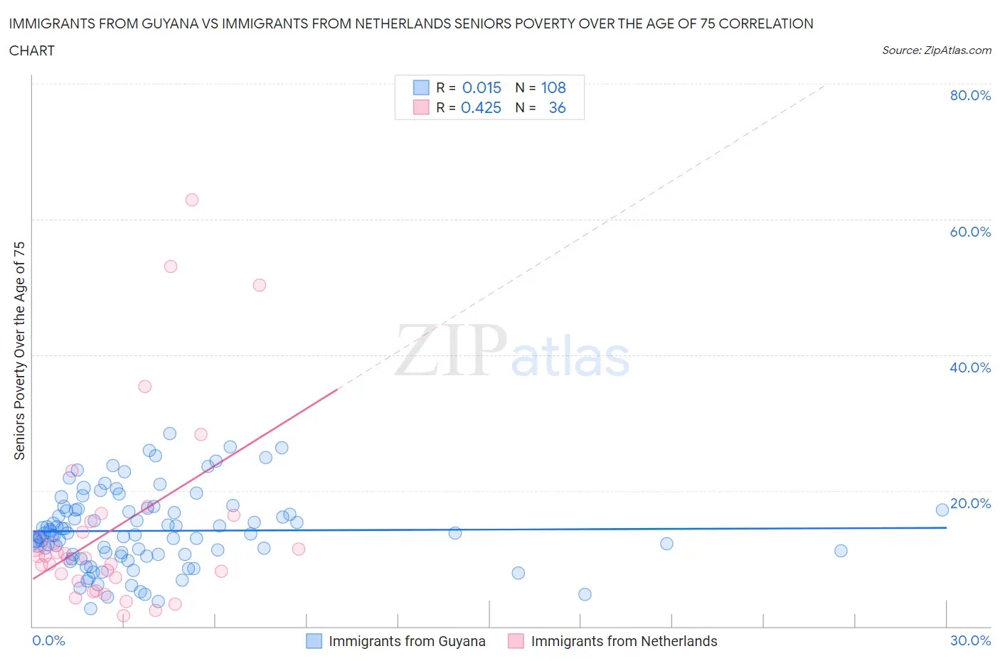 Immigrants from Guyana vs Immigrants from Netherlands Seniors Poverty Over the Age of 75 Correlation Chart