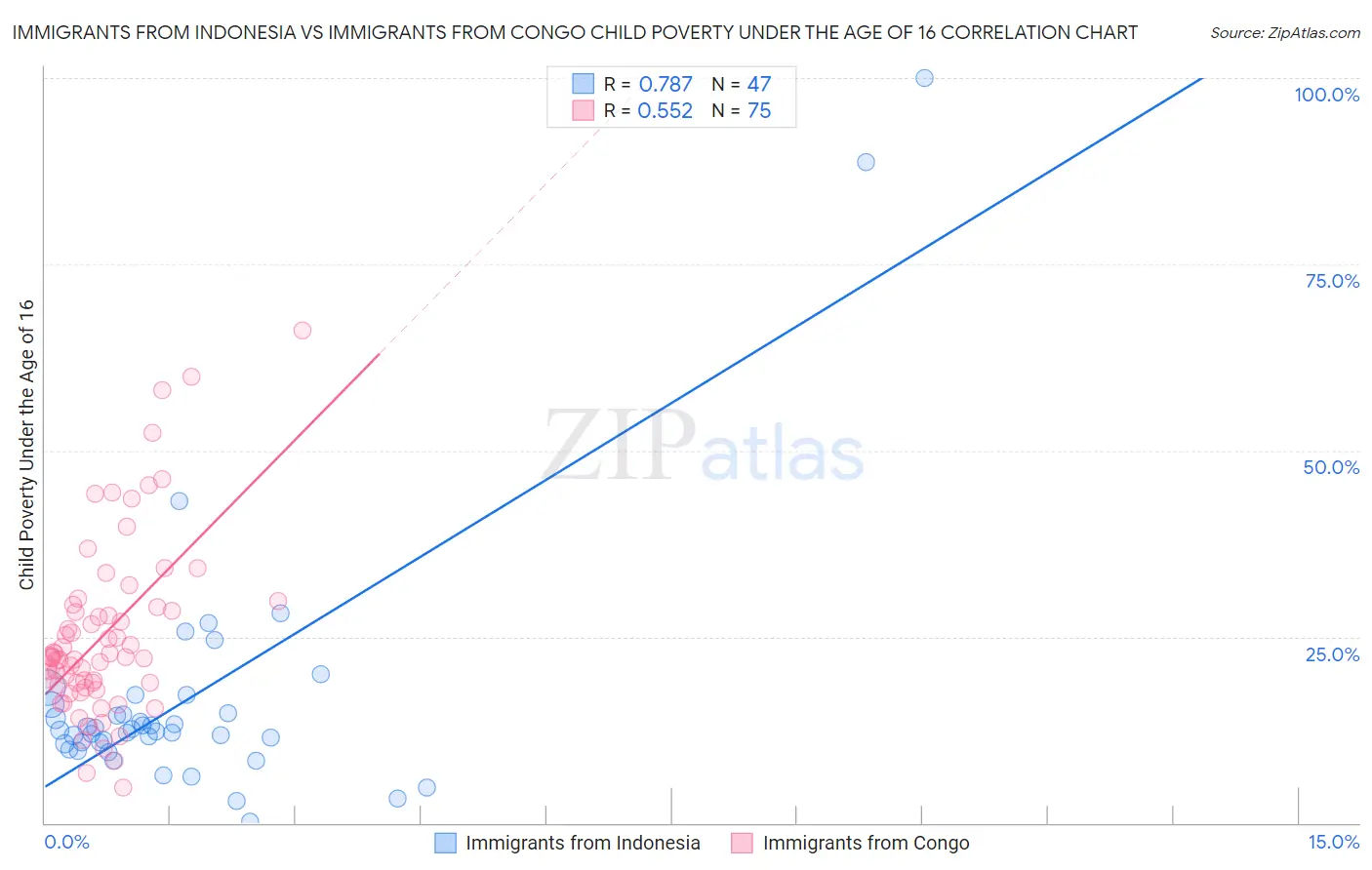 Immigrants from Indonesia vs Immigrants from Congo Child Poverty Under the Age of 16 Correlation Chart