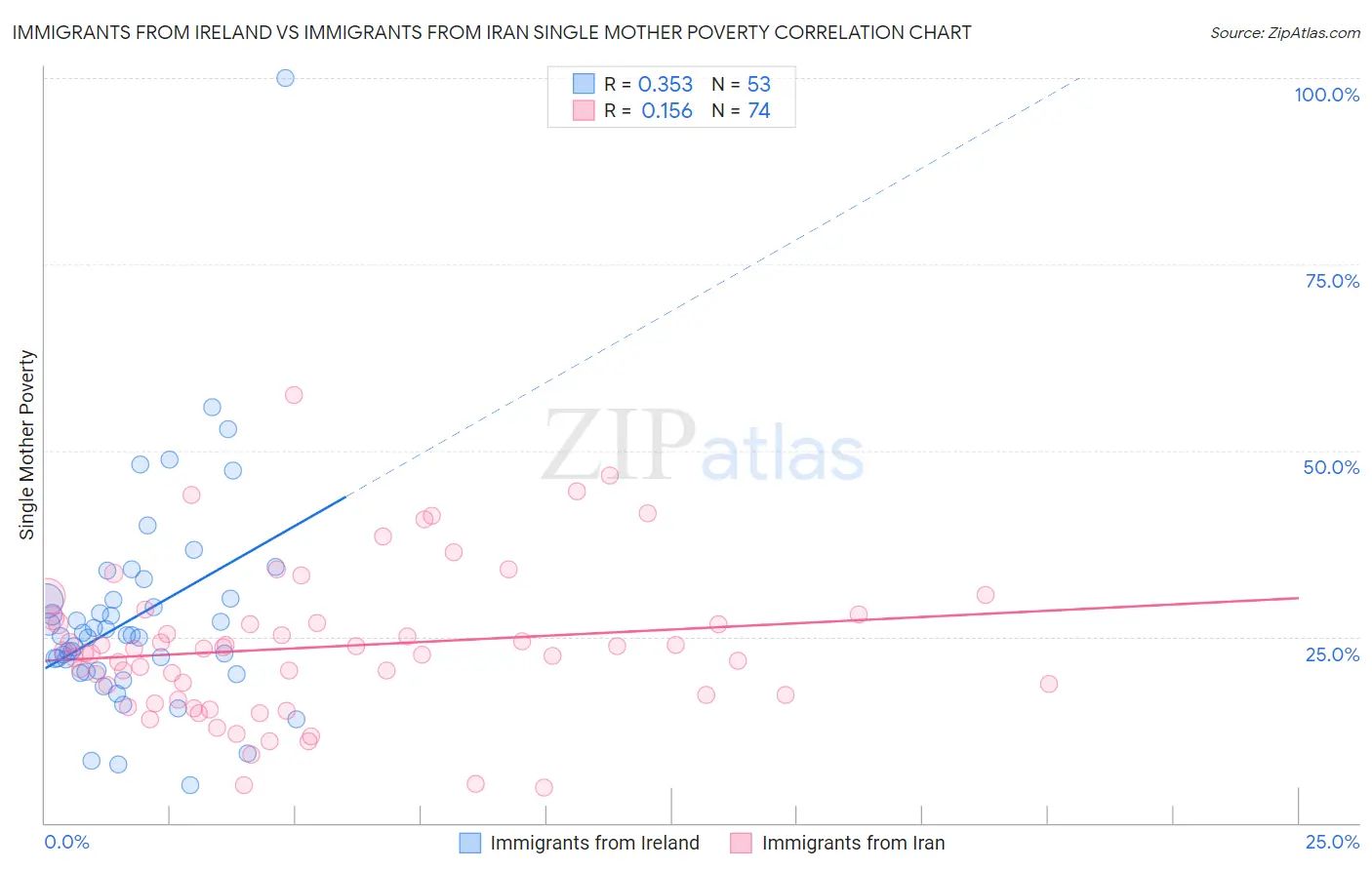 Immigrants from Ireland vs Immigrants from Iran Single Mother Poverty Correlation Chart