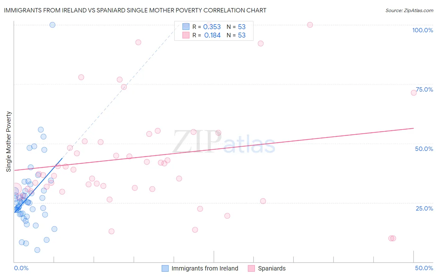 Immigrants from Ireland vs Spaniard Single Mother Poverty Correlation Chart