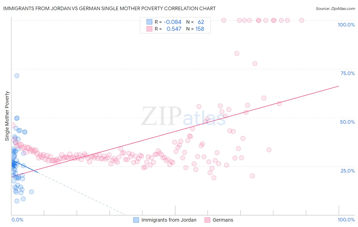 Immigrants from Jordan vs German Single Mother Poverty Correlation Chart
