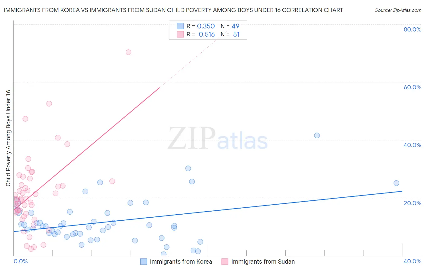 Immigrants from Korea vs Immigrants from Sudan Child Poverty Among Boys Under 16 Correlation Chart