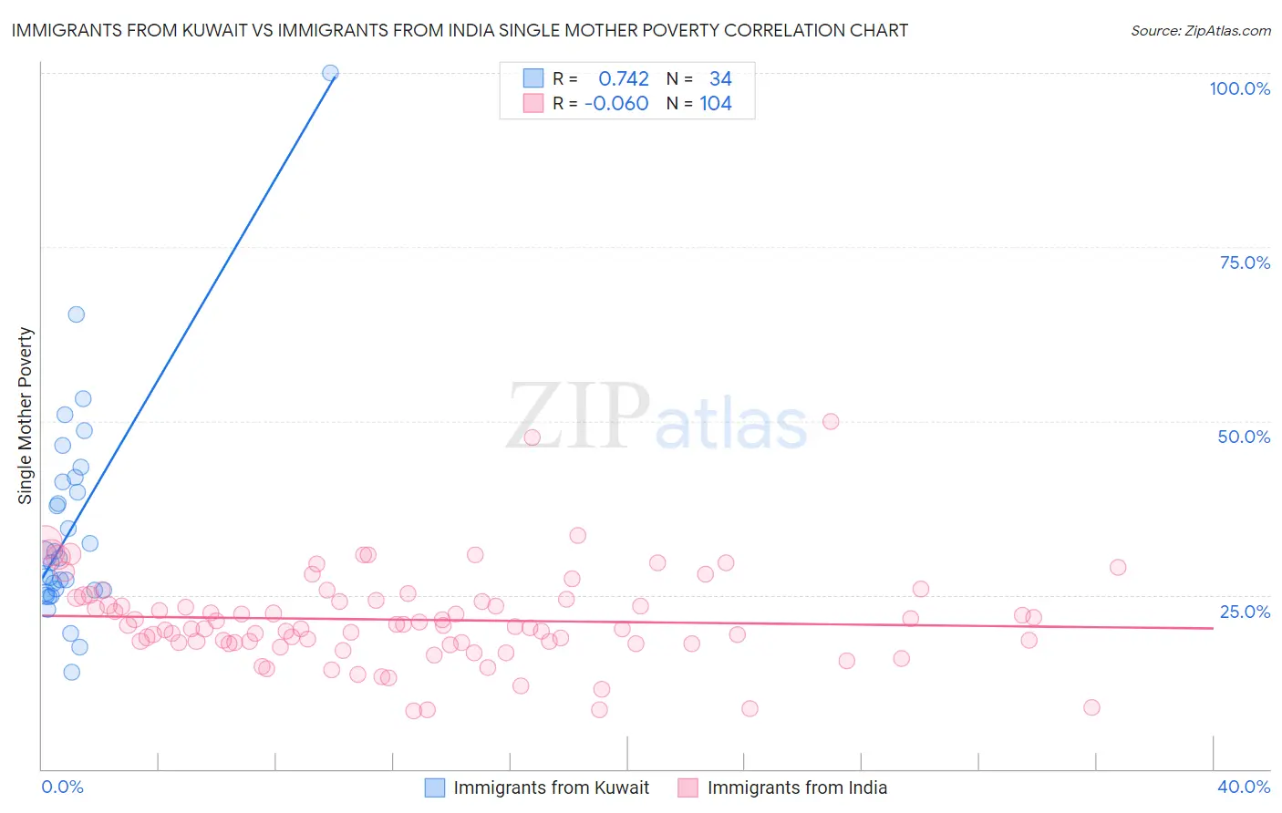 Immigrants from Kuwait vs Immigrants from India Single Mother Poverty Correlation Chart