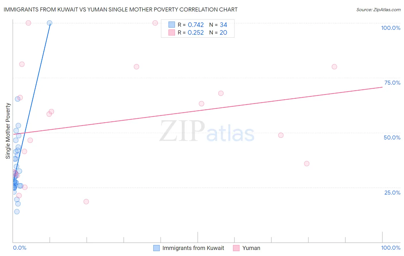Immigrants from Kuwait vs Yuman Single Mother Poverty Correlation Chart