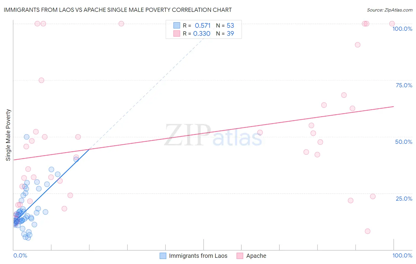 Immigrants from Laos vs Apache Single Male Poverty Correlation Chart