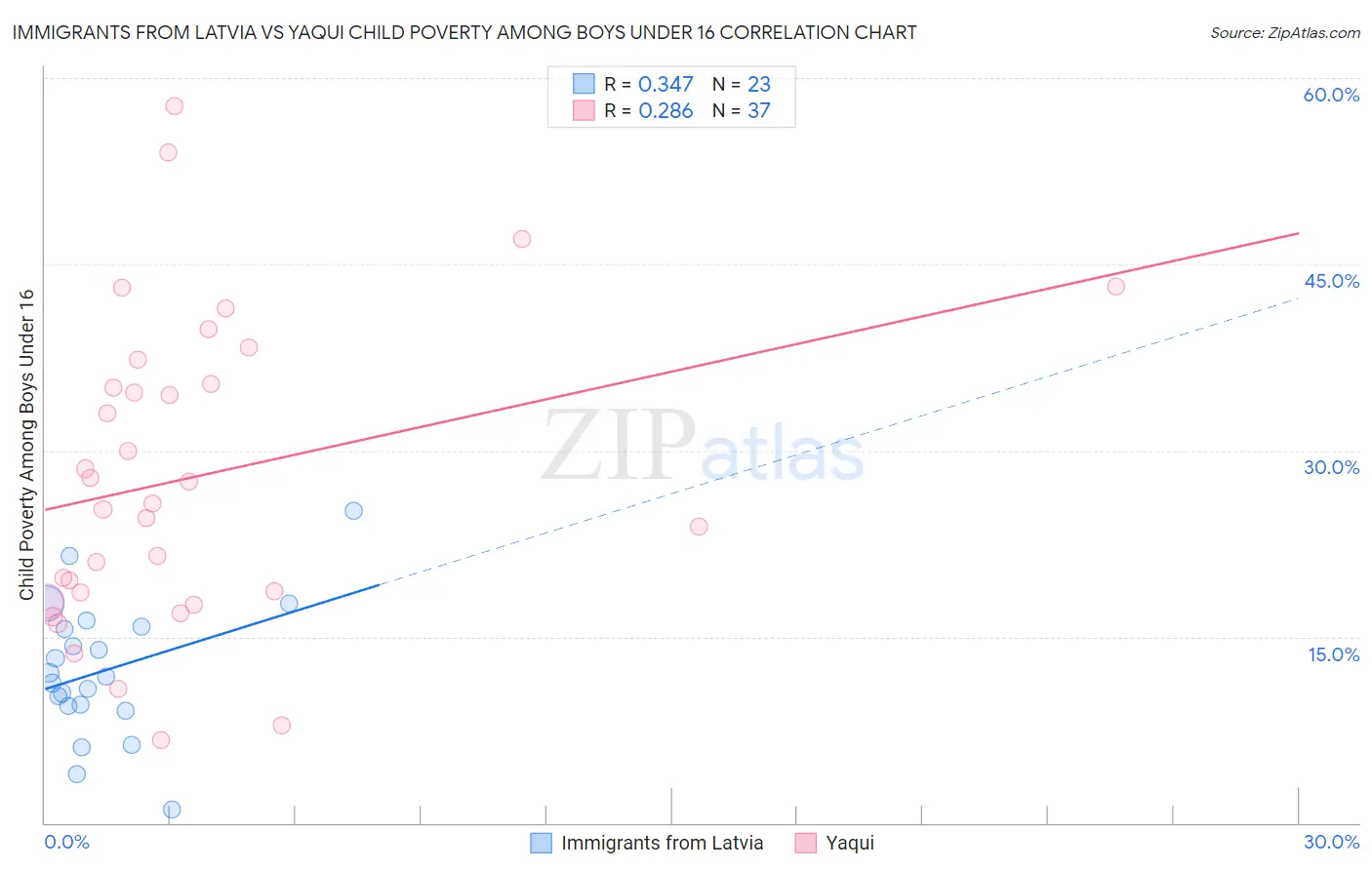 Immigrants from Latvia vs Yaqui Child Poverty Among Boys Under 16 Correlation Chart