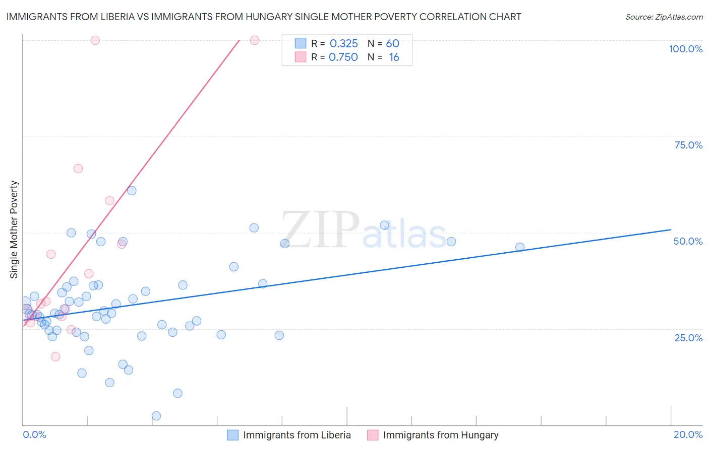 Immigrants from Liberia vs Immigrants from Hungary Single Mother Poverty Correlation Chart