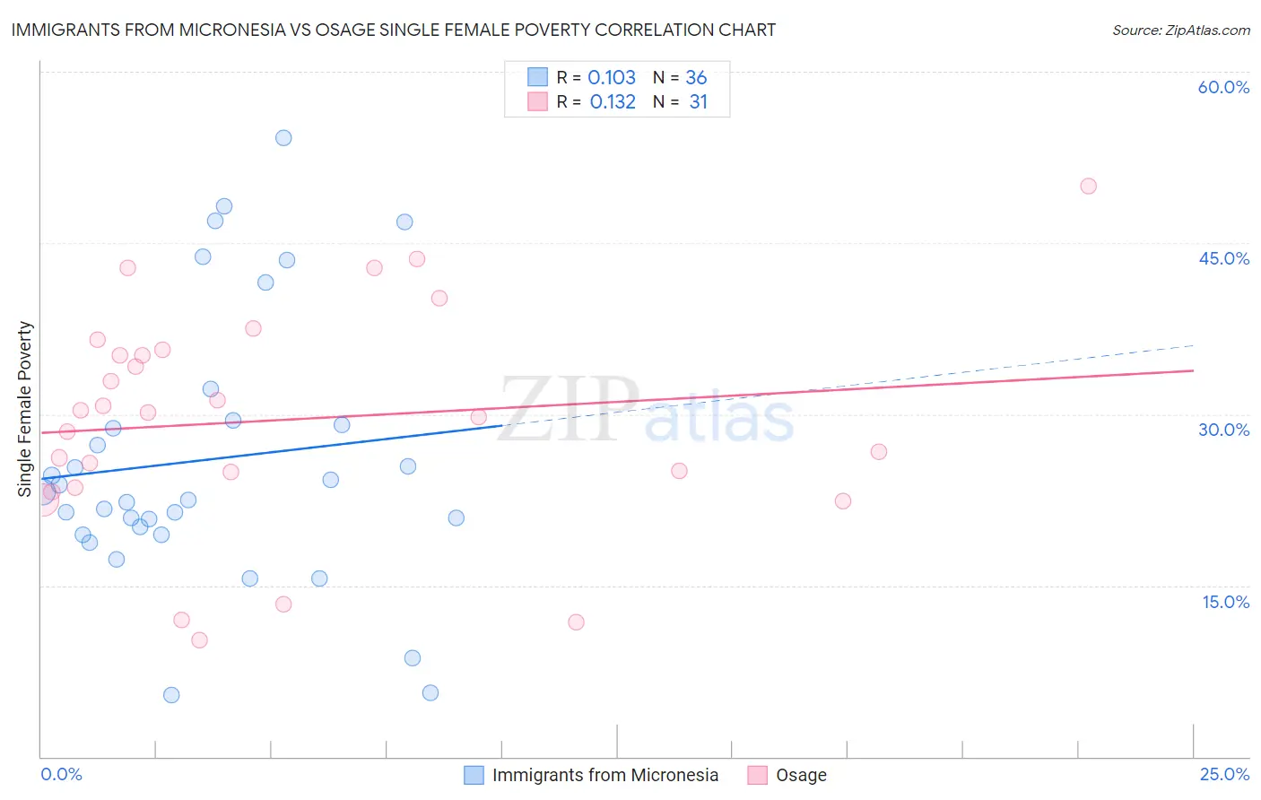 Immigrants from Micronesia vs Osage Single Female Poverty Correlation Chart