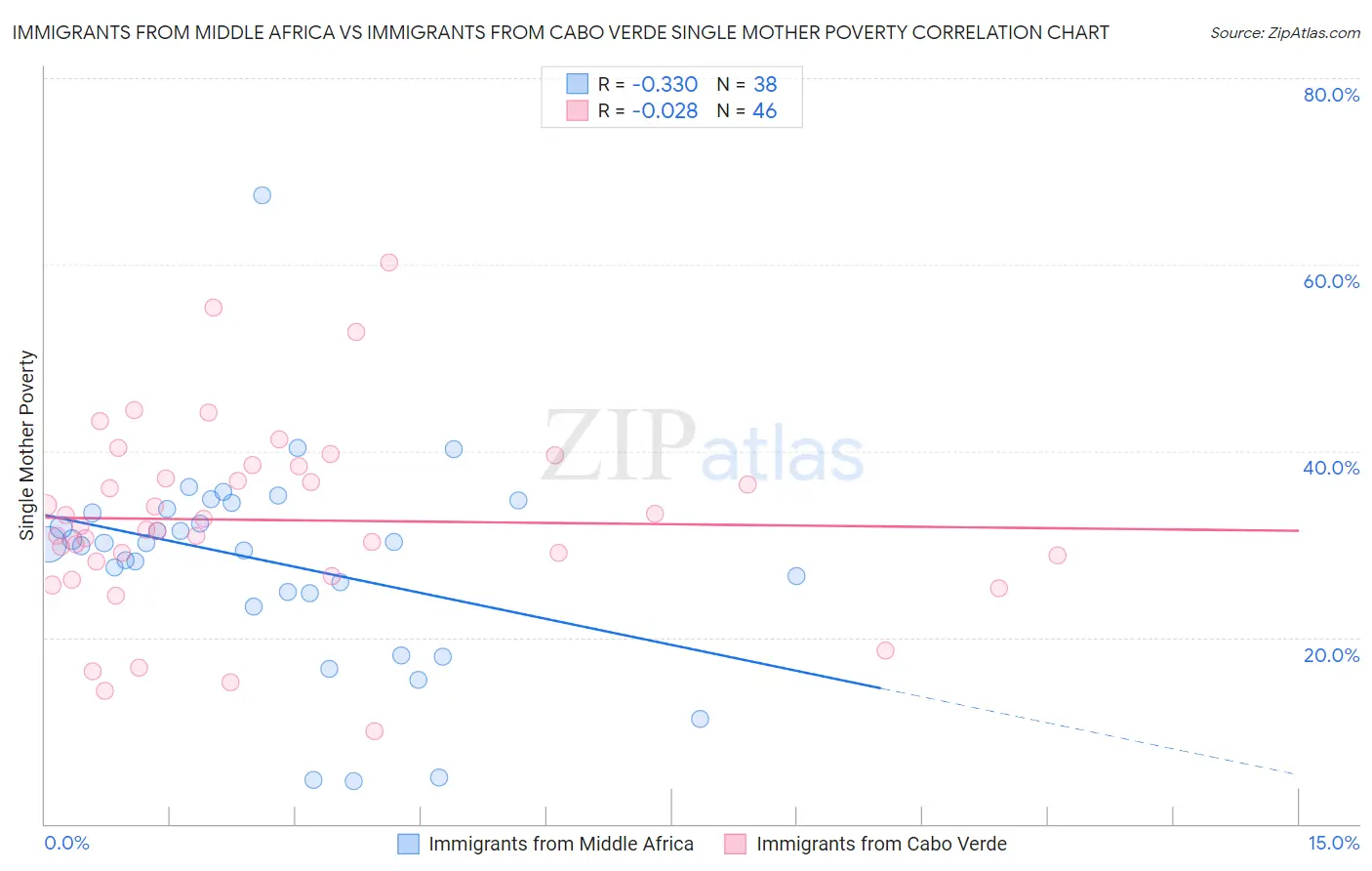 Immigrants from Middle Africa vs Immigrants from Cabo Verde Single Mother Poverty Correlation Chart