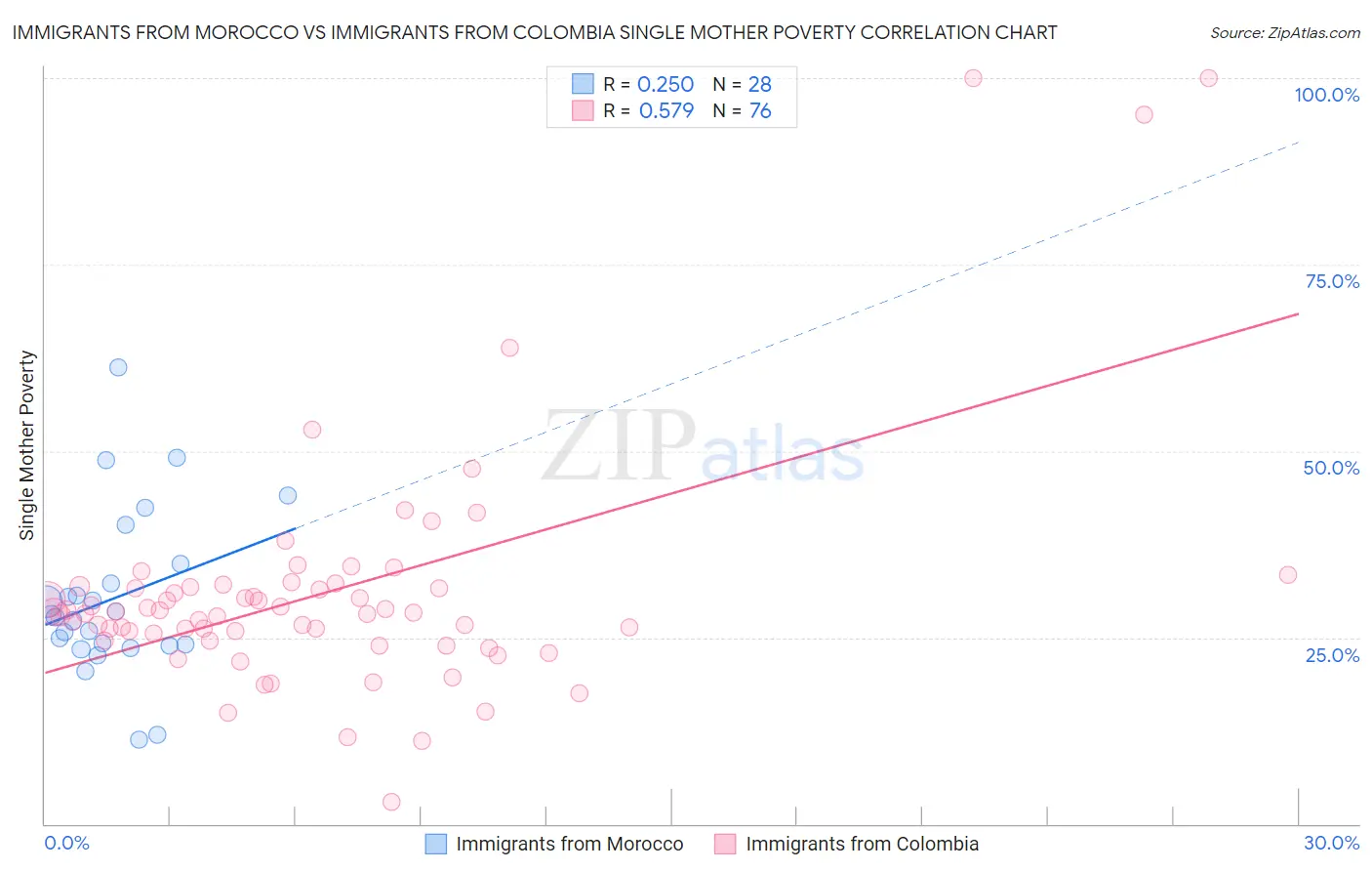 Immigrants from Morocco vs Immigrants from Colombia Single Mother Poverty Correlation Chart