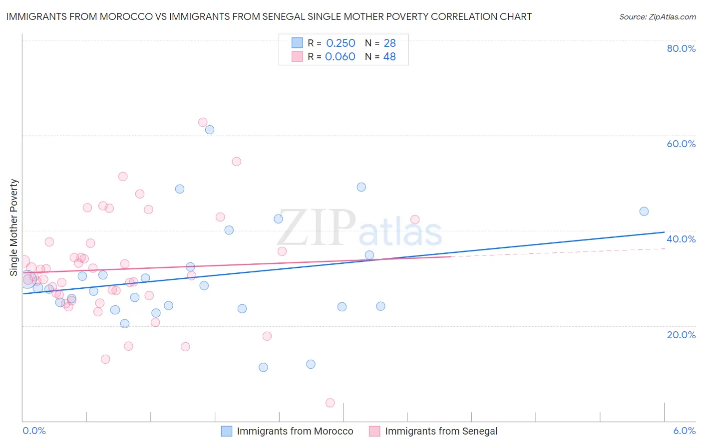 Immigrants from Morocco vs Immigrants from Senegal Single Mother Poverty Correlation Chart