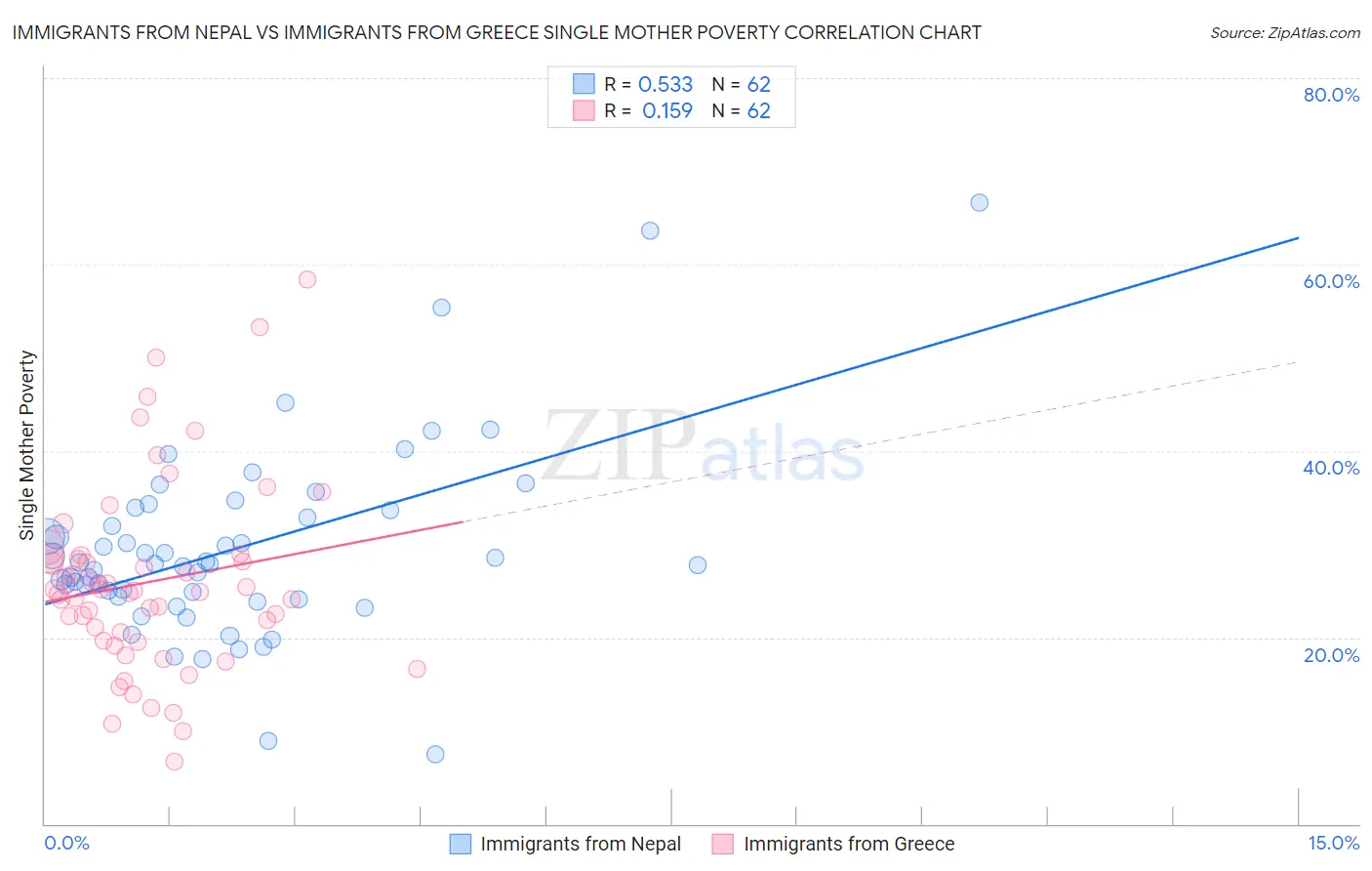 Immigrants from Nepal vs Immigrants from Greece Single Mother Poverty Correlation Chart