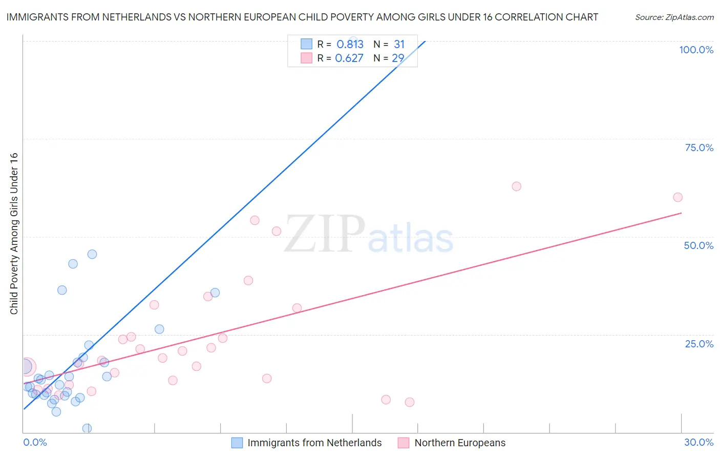 Immigrants from Netherlands vs Northern European Child Poverty Among Girls Under 16 Correlation Chart