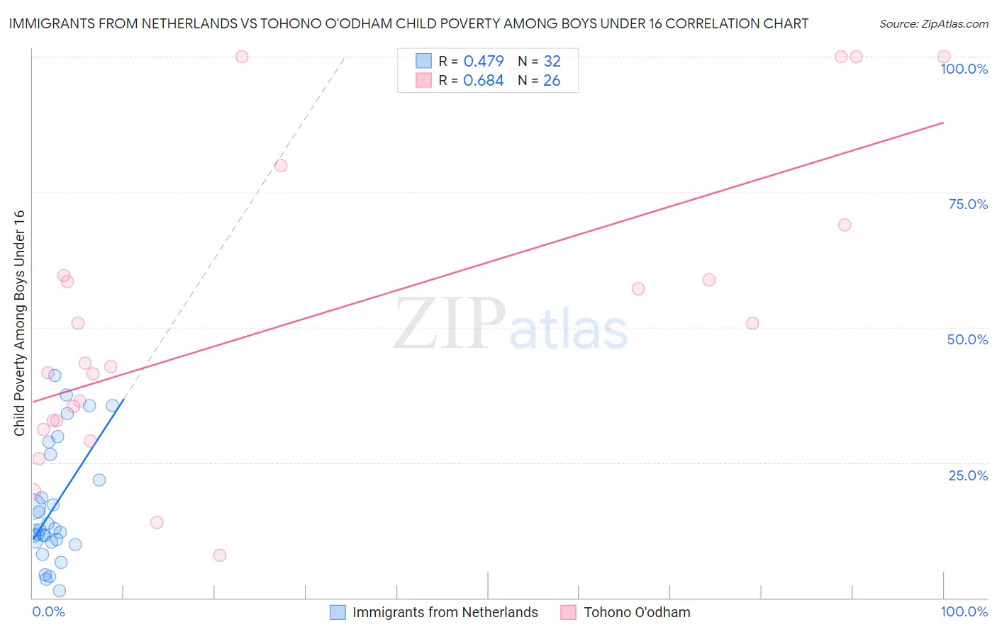 Immigrants from Netherlands vs Tohono O'odham Child Poverty Among Boys Under 16 Correlation Chart