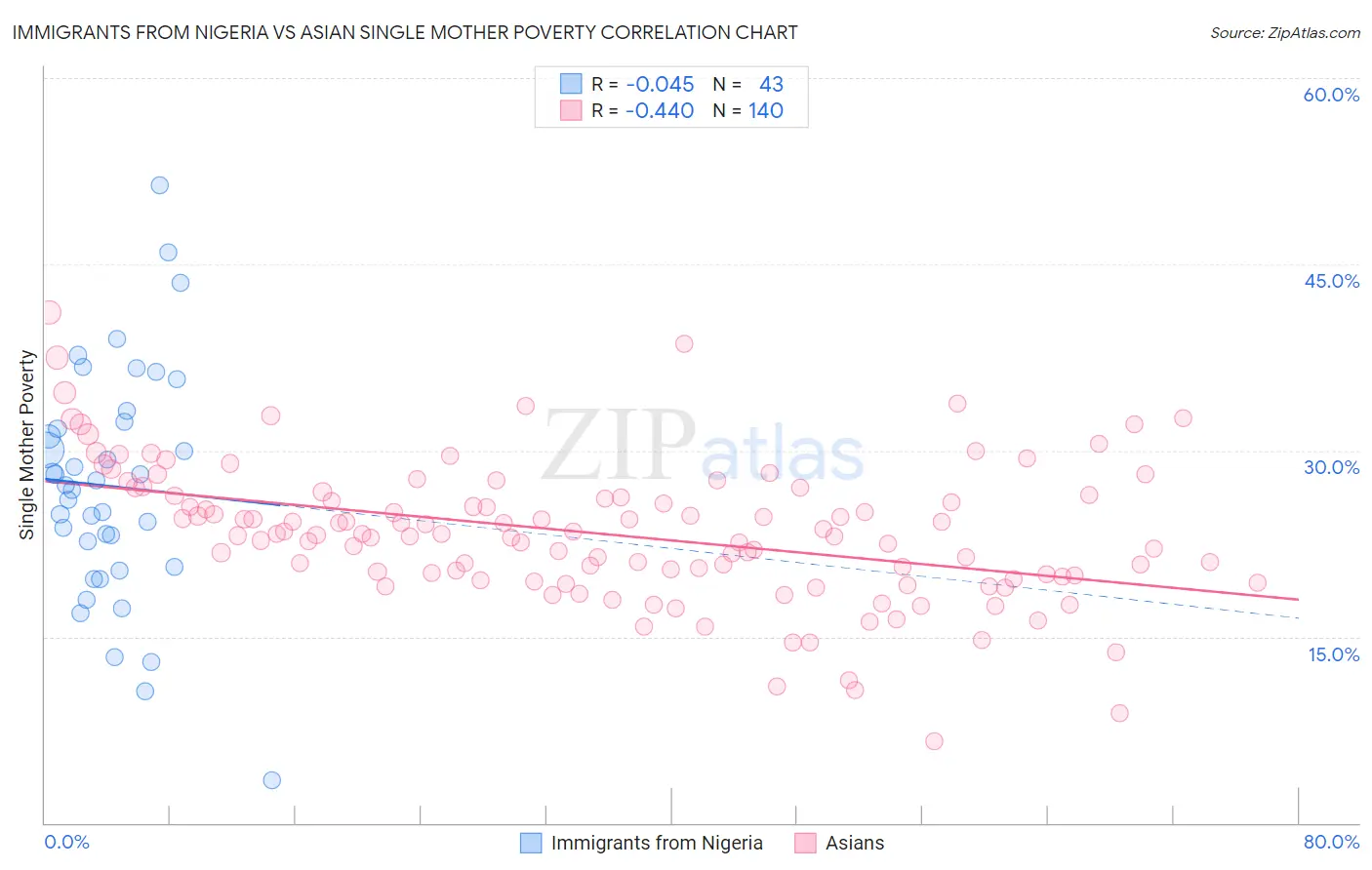 Immigrants from Nigeria vs Asian Single Mother Poverty Correlation Chart