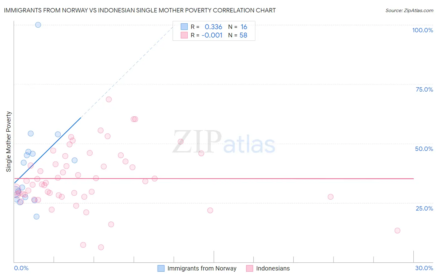 Immigrants from Norway vs Indonesian Single Mother Poverty Correlation Chart