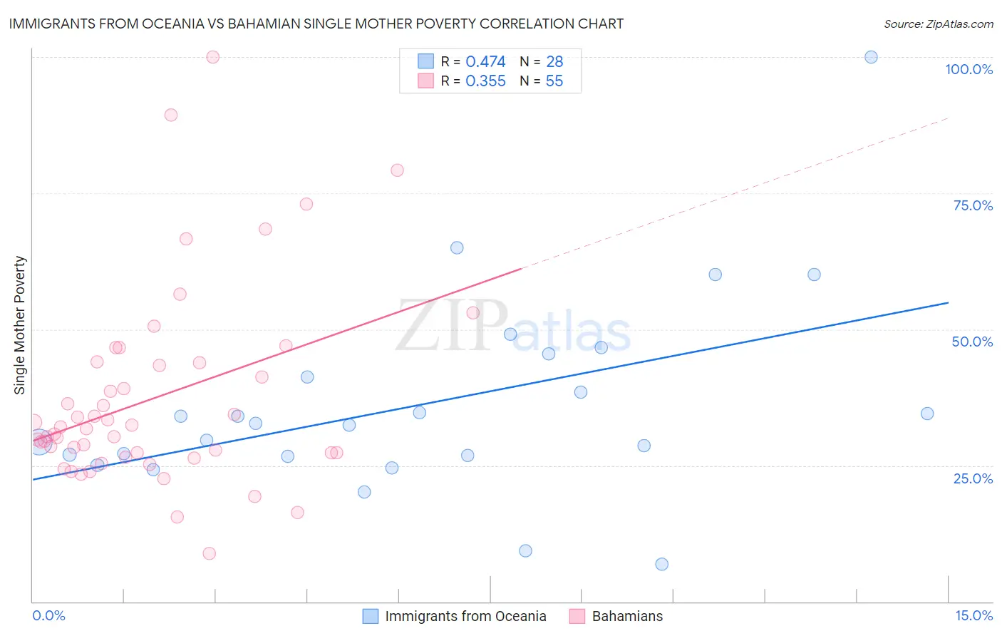 Immigrants from Oceania vs Bahamian Single Mother Poverty Correlation Chart