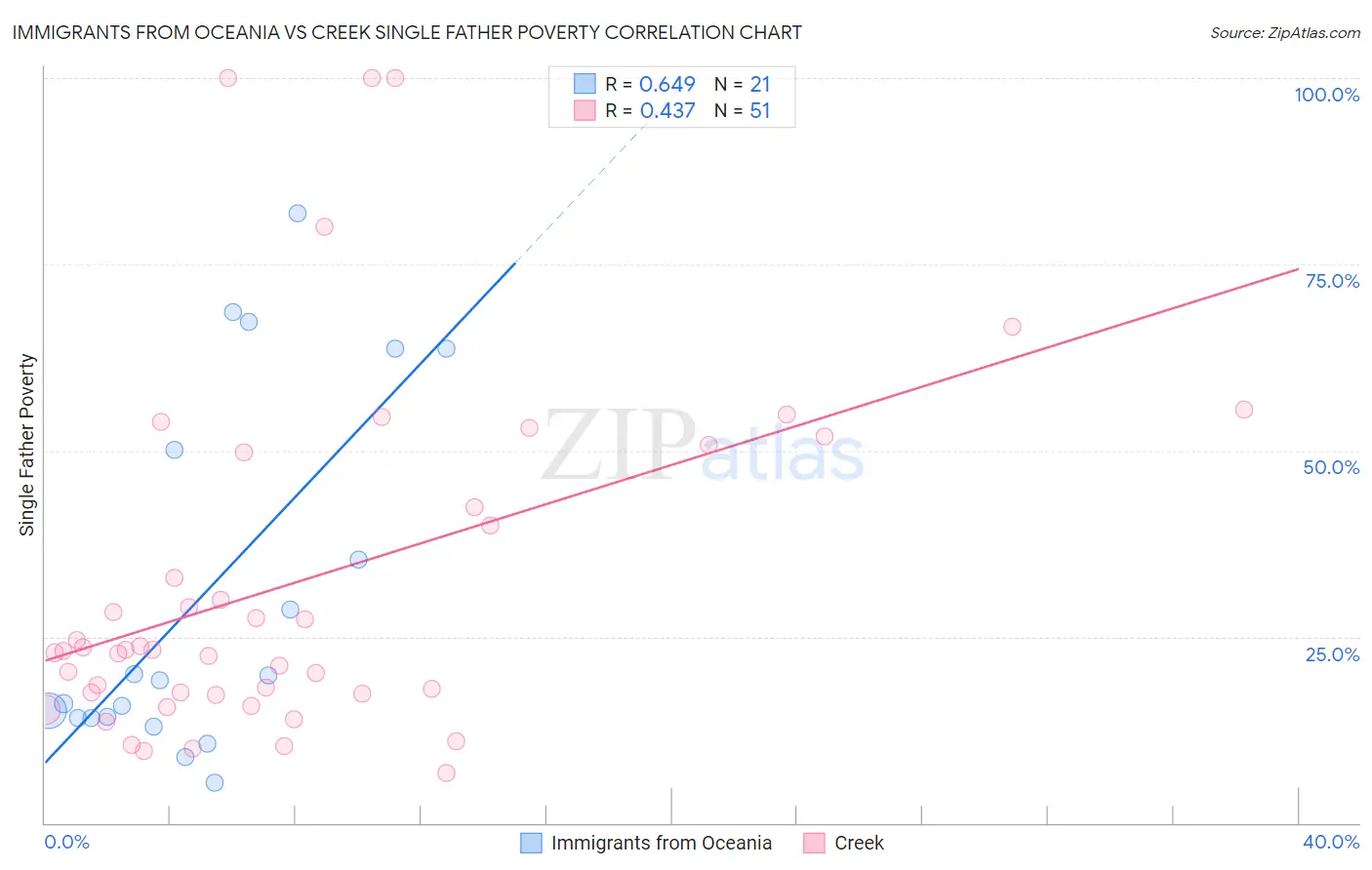 Immigrants from Oceania vs Creek Single Father Poverty Correlation Chart