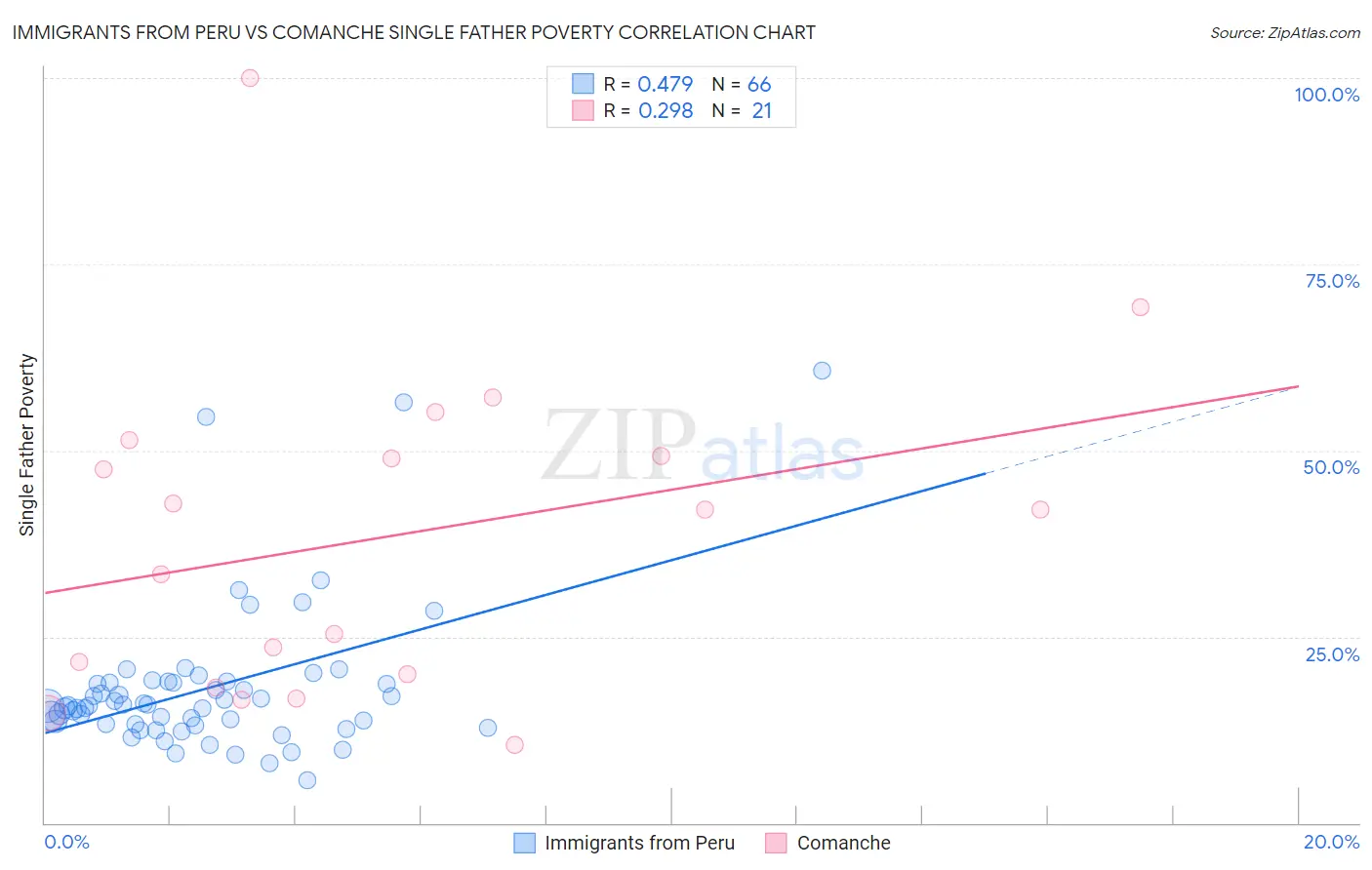 Immigrants from Peru vs Comanche Single Father Poverty Correlation Chart