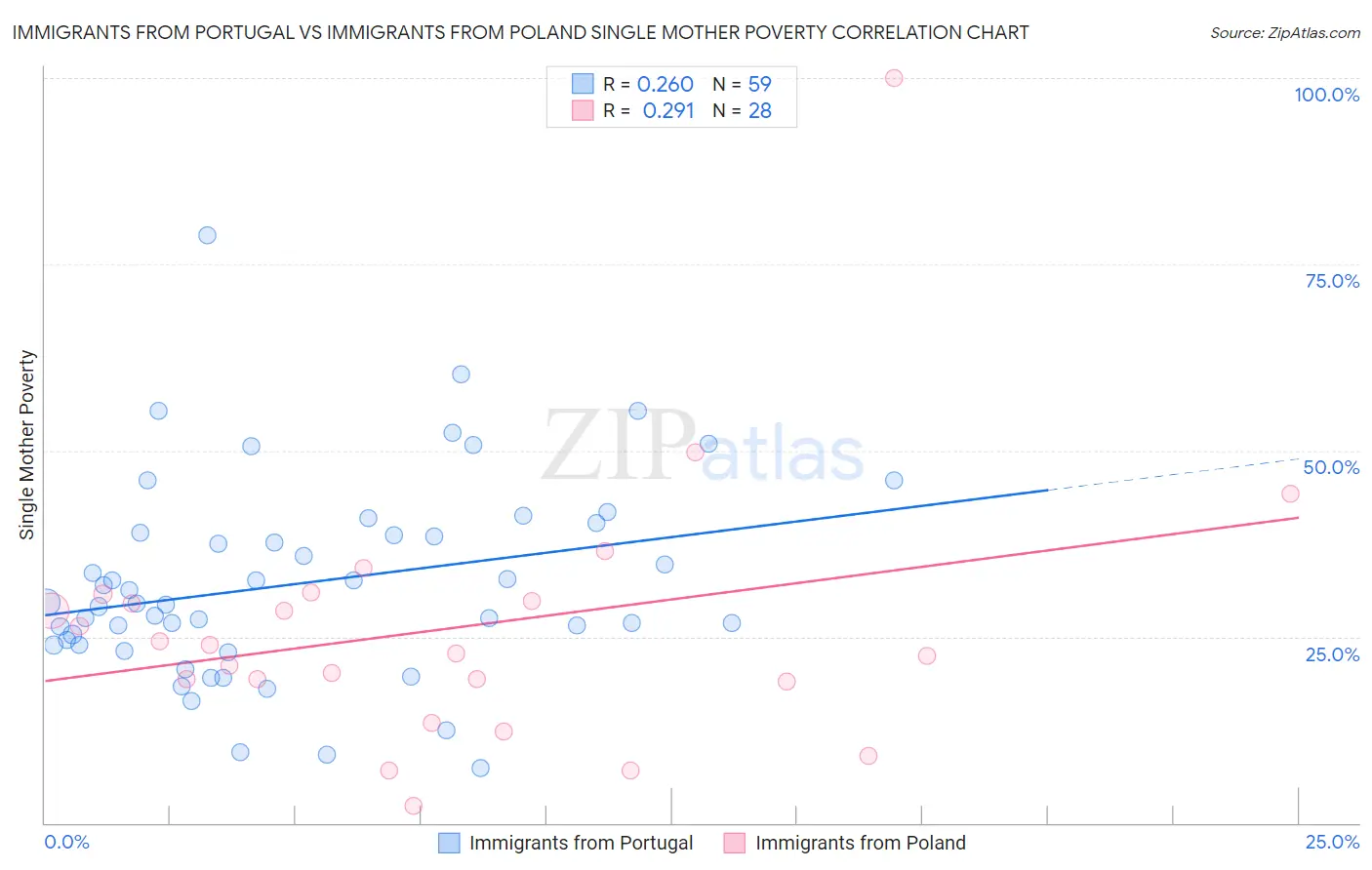 Immigrants from Portugal vs Immigrants from Poland Single Mother Poverty Correlation Chart