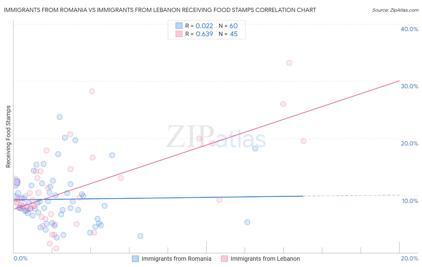 Immigrants from Romania vs Immigrants from Lebanon Receiving Food Stamps Correlation Chart