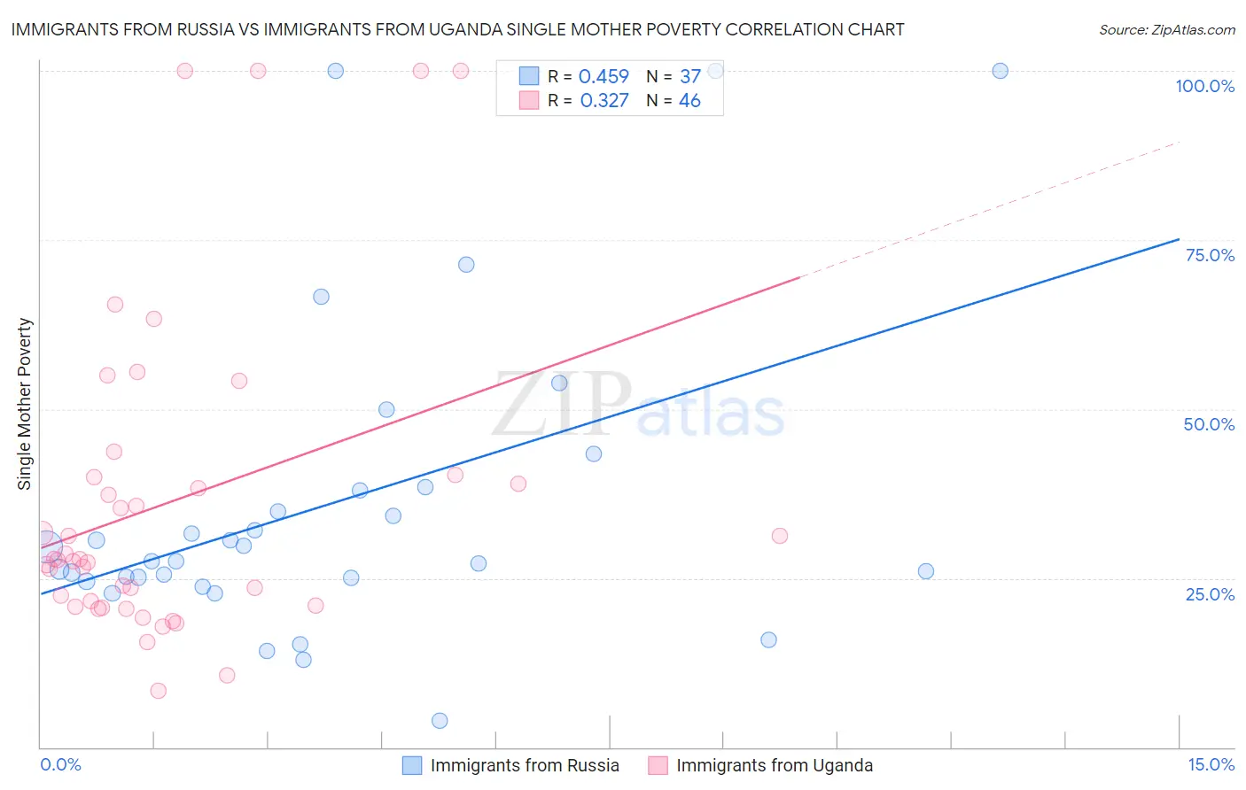 Immigrants from Russia vs Immigrants from Uganda Single Mother Poverty Correlation Chart