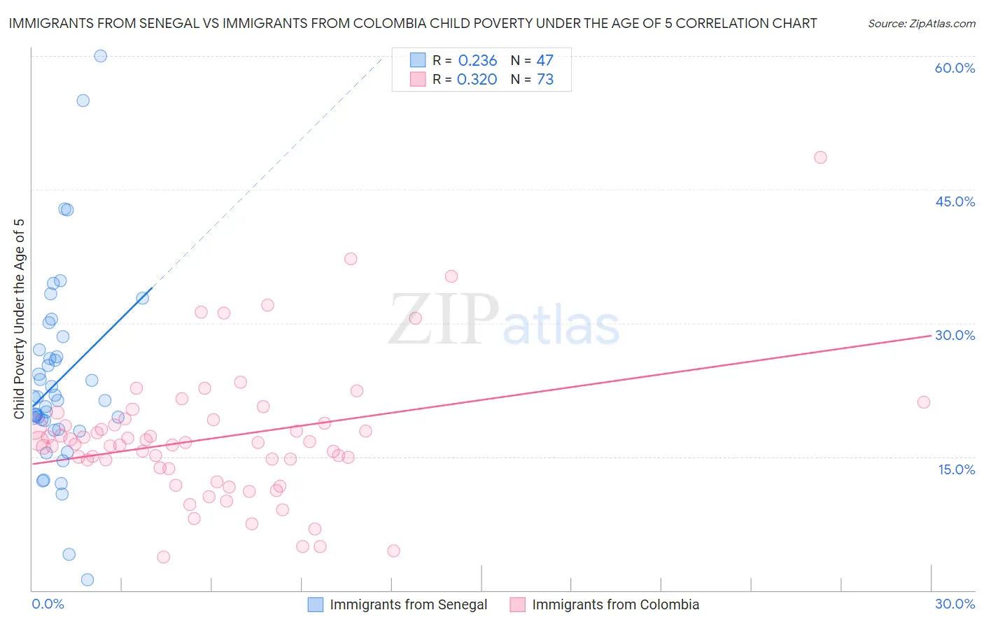 Immigrants from Senegal vs Immigrants from Colombia Child Poverty Under the Age of 5 Correlation Chart