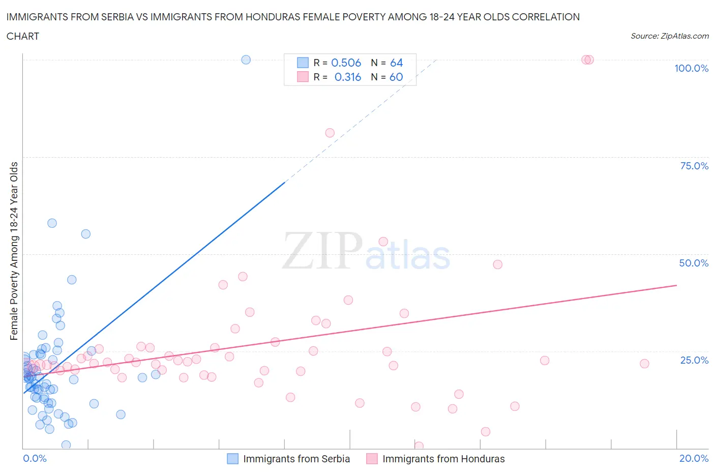 Immigrants from Serbia vs Immigrants from Honduras Female Poverty Among 18-24 Year Olds Correlation Chart