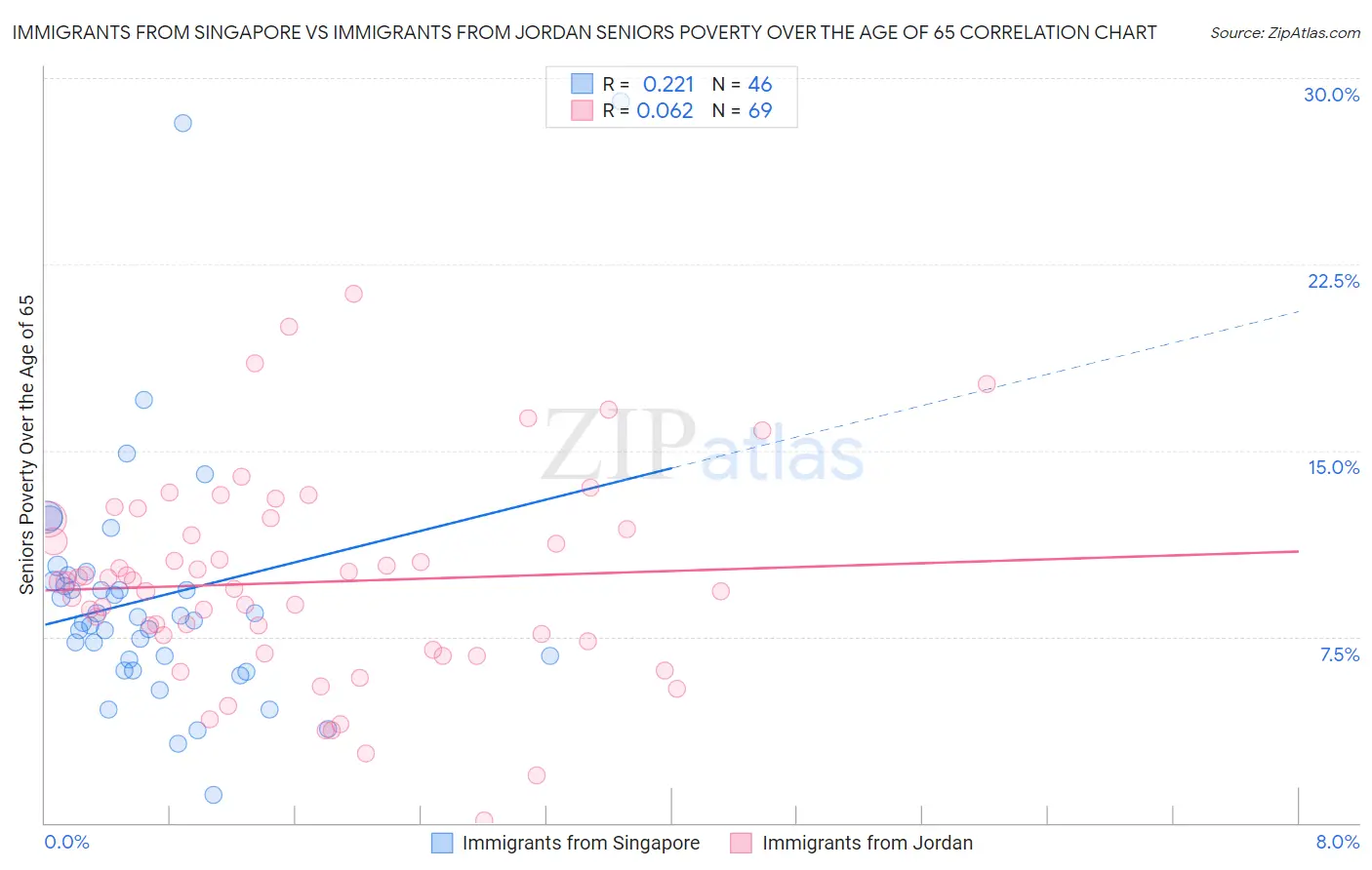 Immigrants from Singapore vs Immigrants from Jordan Seniors Poverty Over the Age of 65 Correlation Chart