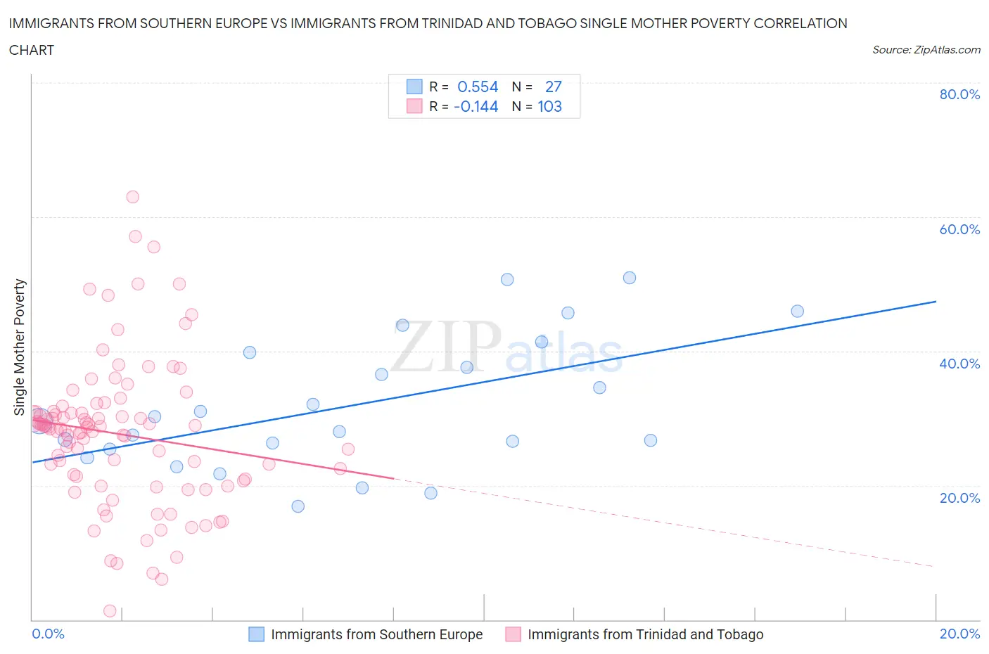 Immigrants from Southern Europe vs Immigrants from Trinidad and Tobago Single Mother Poverty Correlation Chart