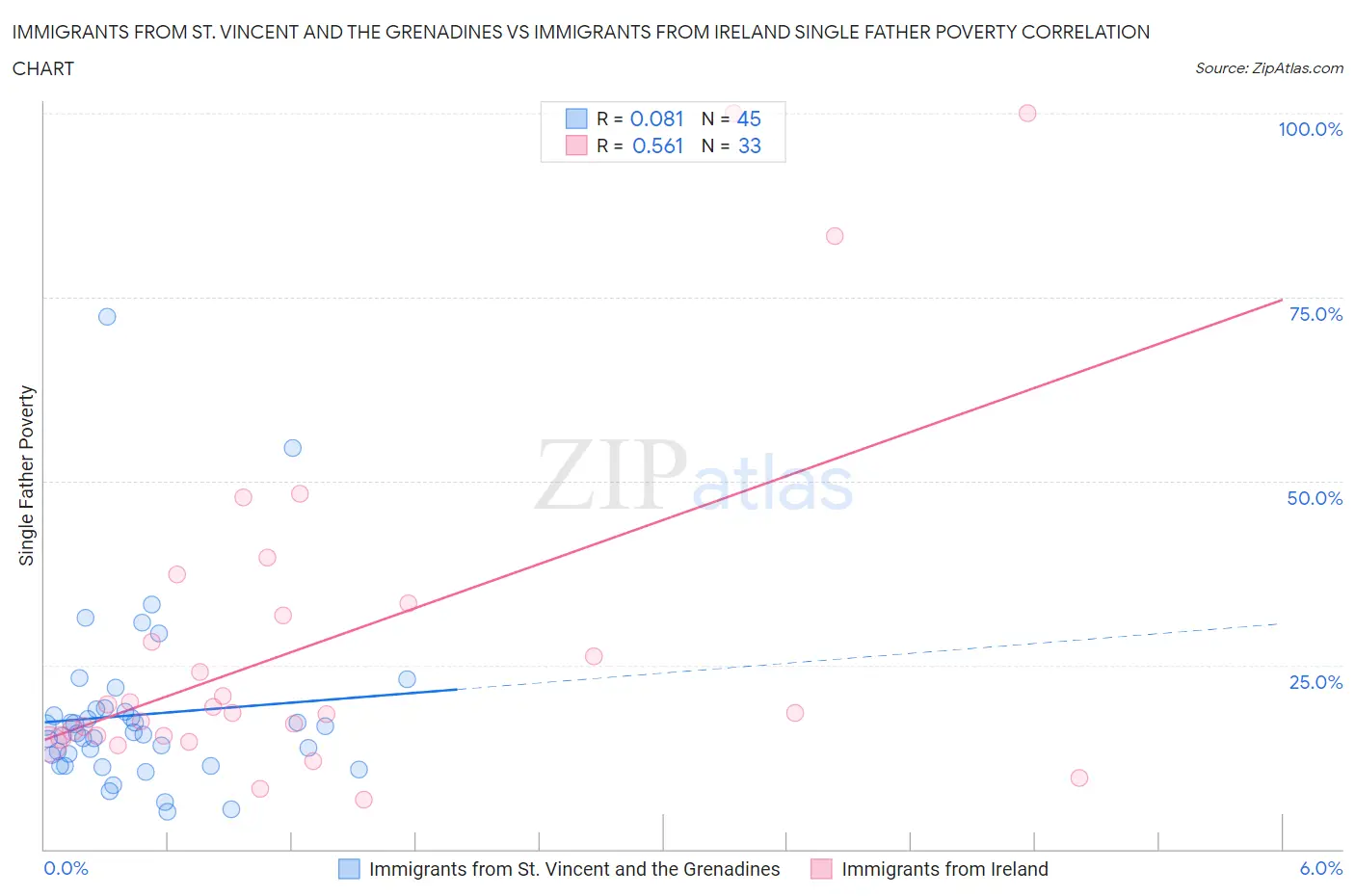 Immigrants from St. Vincent and the Grenadines vs Immigrants from Ireland Single Father Poverty Correlation Chart