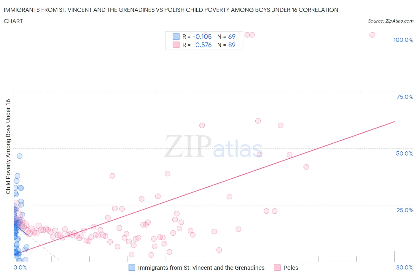 Immigrants from St. Vincent and the Grenadines vs Polish Child Poverty Among Boys Under 16 Correlation Chart