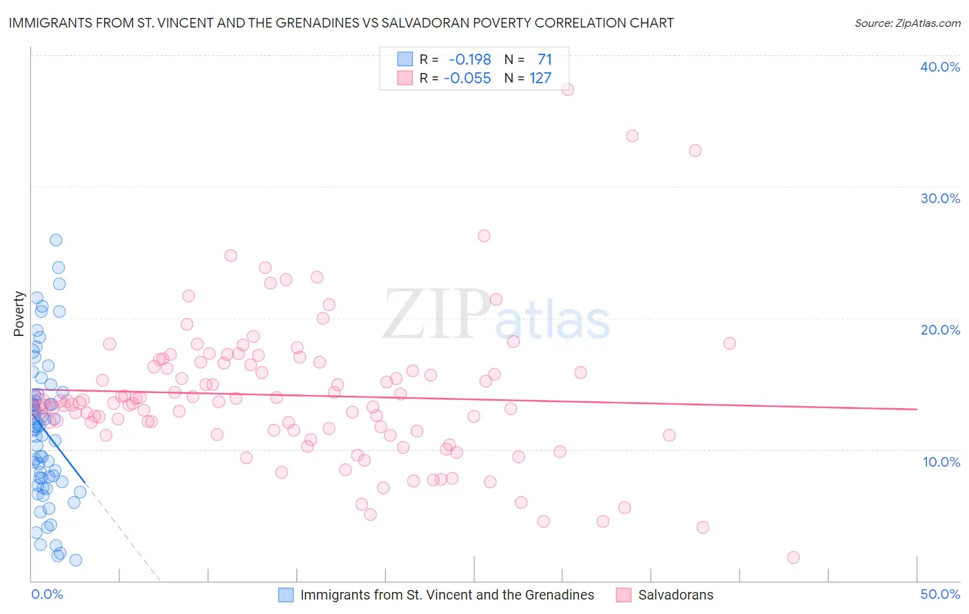The statistical analysis conducted on geographies consisting of 56,091,353 people shows a poor negative correlation between the proportion of Immigrants from St. Vincent and the Grenadines and poverty level in the United States with a correlation coefficient (R) of -0.198 and weighted average of 14.9%. Similarly, the statistical analysis conducted on geographies consisting of 398,710,634 people shows a slight negative correlation between the proportion of Salvadorans and poverty level in the United States with a correlation coefficient (R) of -0.055 and weighted average of 14.0%, a difference of 6.5%.