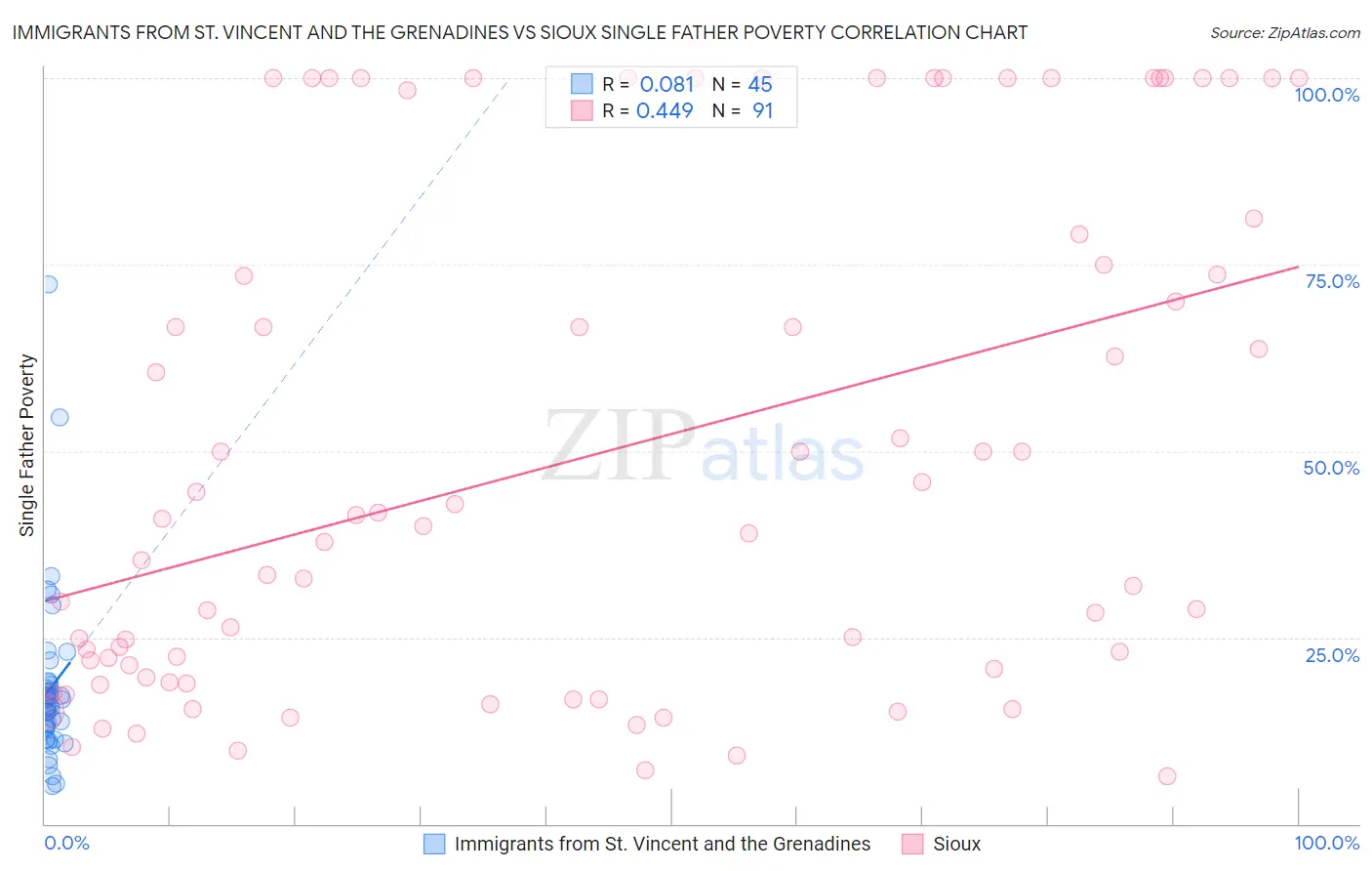 Immigrants from St. Vincent and the Grenadines vs Sioux Single Father Poverty Correlation Chart