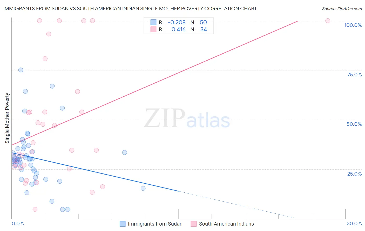 Immigrants from Sudan vs South American Indian Single Mother Poverty Correlation Chart
