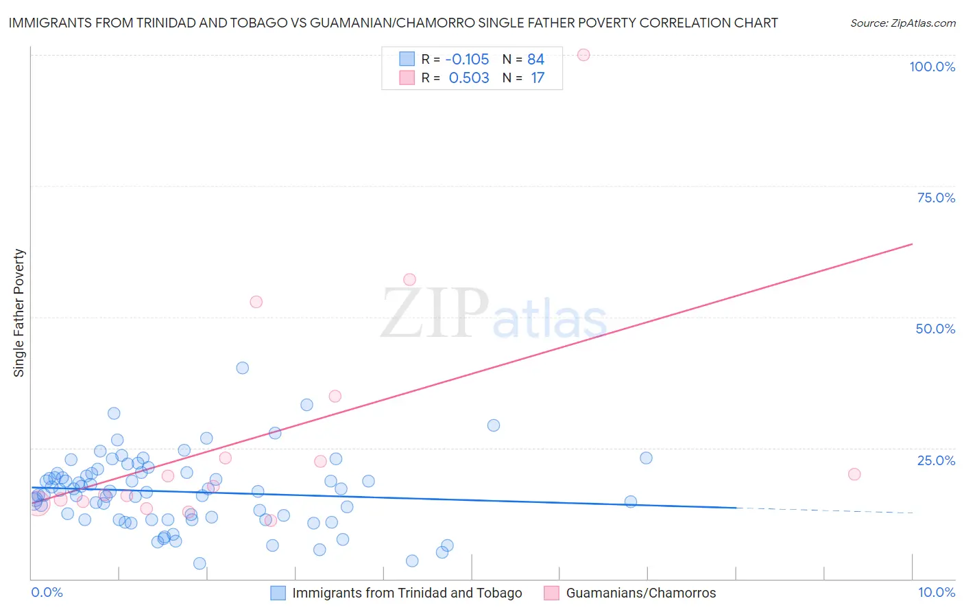 Immigrants from Trinidad and Tobago vs Guamanian/Chamorro Single Father Poverty Correlation Chart