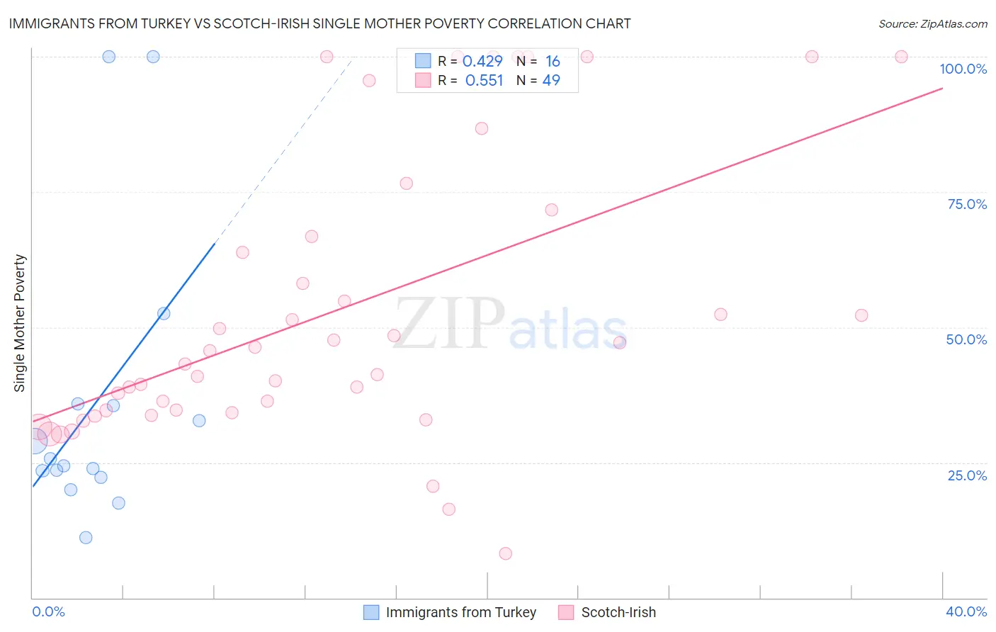Immigrants from Turkey vs Scotch-Irish Single Mother Poverty Correlation Chart