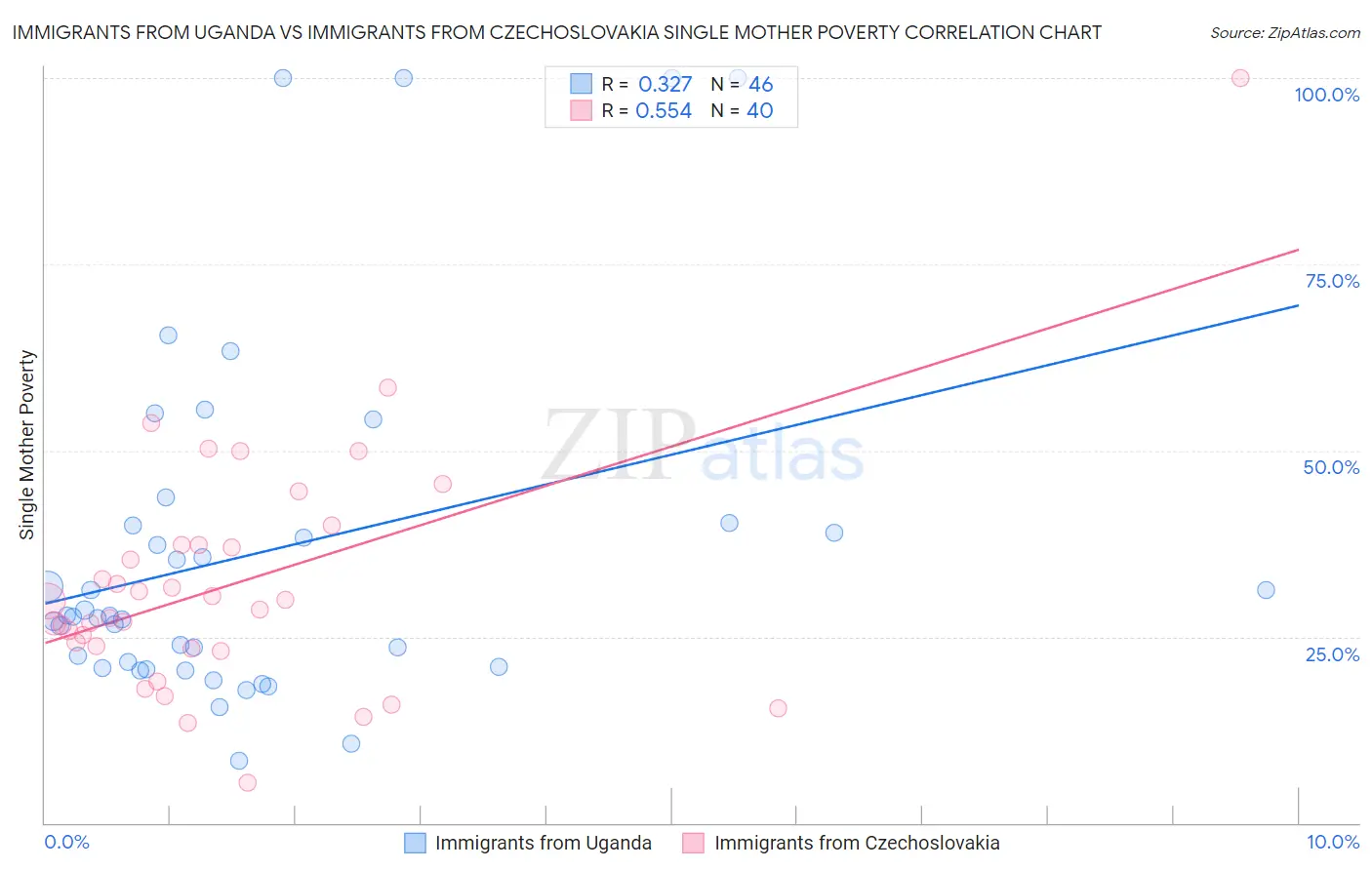 Immigrants from Uganda vs Immigrants from Czechoslovakia Single Mother Poverty Correlation Chart