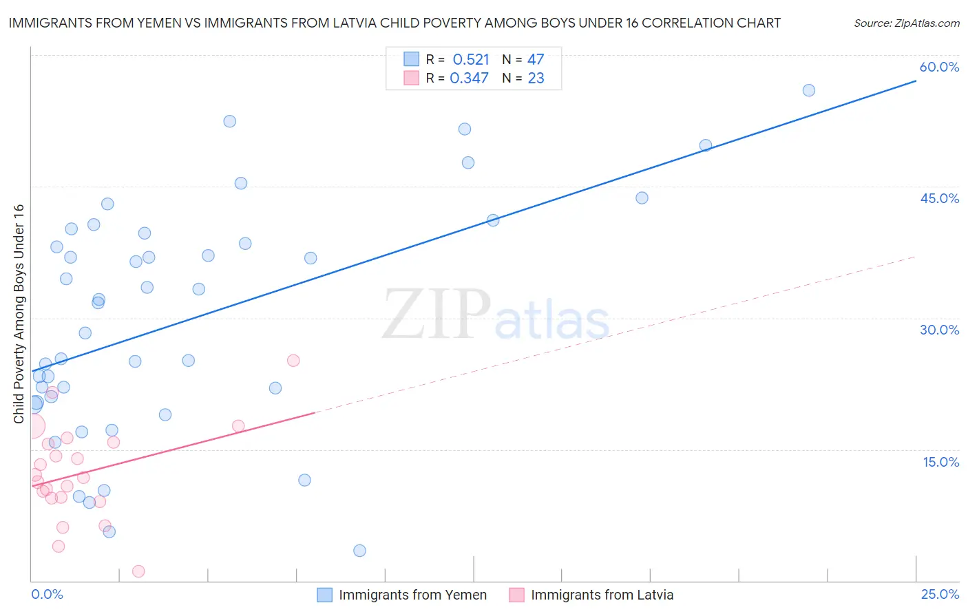 Immigrants from Yemen vs Immigrants from Latvia Child Poverty Among Boys Under 16 Correlation Chart
