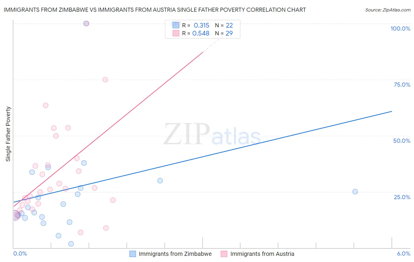 Immigrants from Zimbabwe vs Immigrants from Austria Single Father Poverty Correlation Chart