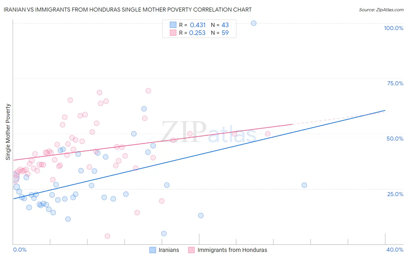 Iranian vs Immigrants from Honduras Single Mother Poverty Correlation Chart