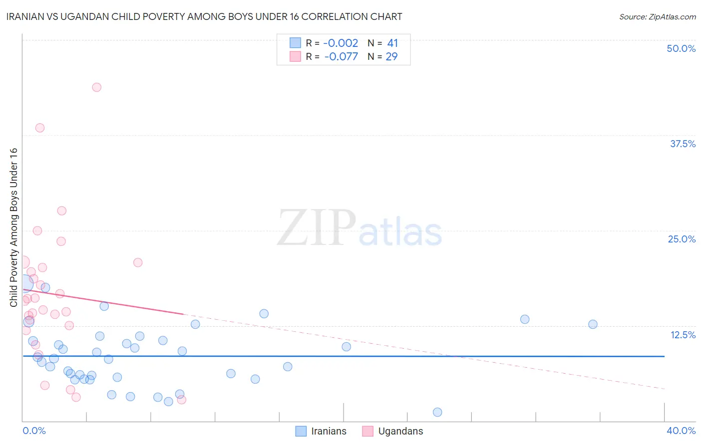 The statistical analysis conducted on geographies consisting of 312,150,992 people shows no correlation between the proportion of Iranians and poverty level among boys under the age of 16 in the United States with a correlation coefficient (R) of -0.002 and weighted average of 12.4%. Similarly, the statistical analysis conducted on geographies consisting of 93,708,162 people shows a slight negative correlation between the proportion of Ugandans and poverty level among boys under the age of 16 in the United States with a correlation coefficient (R) of -0.077 and weighted average of 17.3%, a difference of 39.2%.