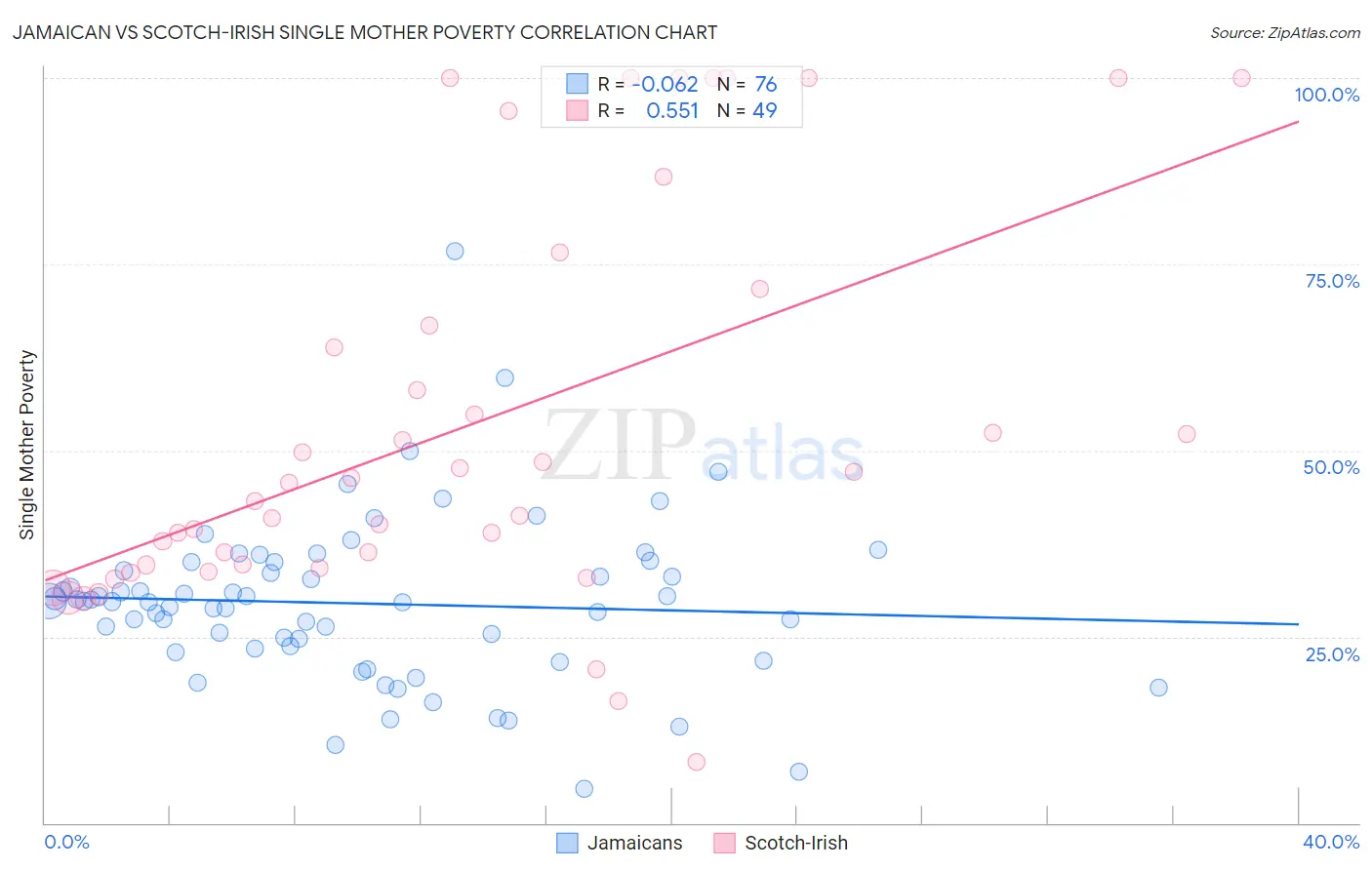 The statistical analysis conducted on geographies consisting of 360,593,795 people shows a slight negative correlation between the proportion of Jamaicans and poverty level among single mothers in the United States with a correlation coefficient (R) of -0.062 and weighted average of 29.9%. Similarly, the statistical analysis conducted on geographies consisting of 524,083,922 people shows a substantial positive correlation between the proportion of Scotch-Irish and poverty level among single mothers in the United States with a correlation coefficient (R) of 0.551 and weighted average of 31.5%, a difference of 5.4%.
