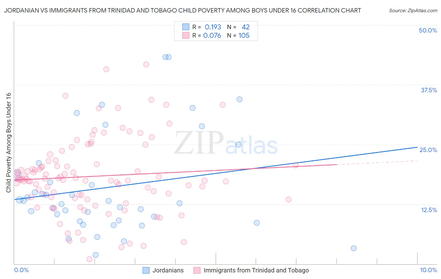 Jordanian vs Immigrants from Trinidad and Tobago Child Poverty Among Boys Under 16 Correlation Chart