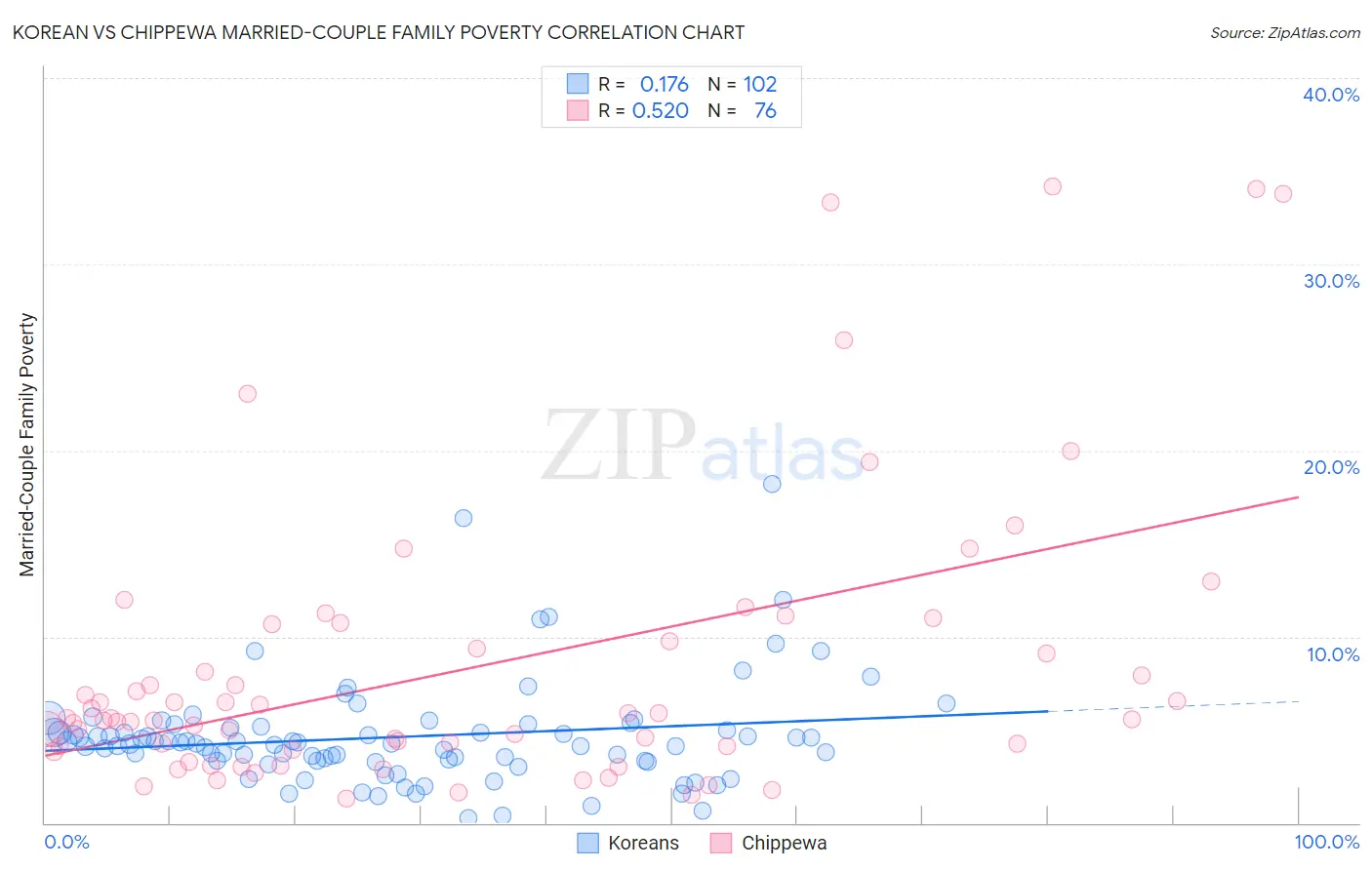 Korean vs Chippewa Married-Couple Family Poverty Correlation Chart