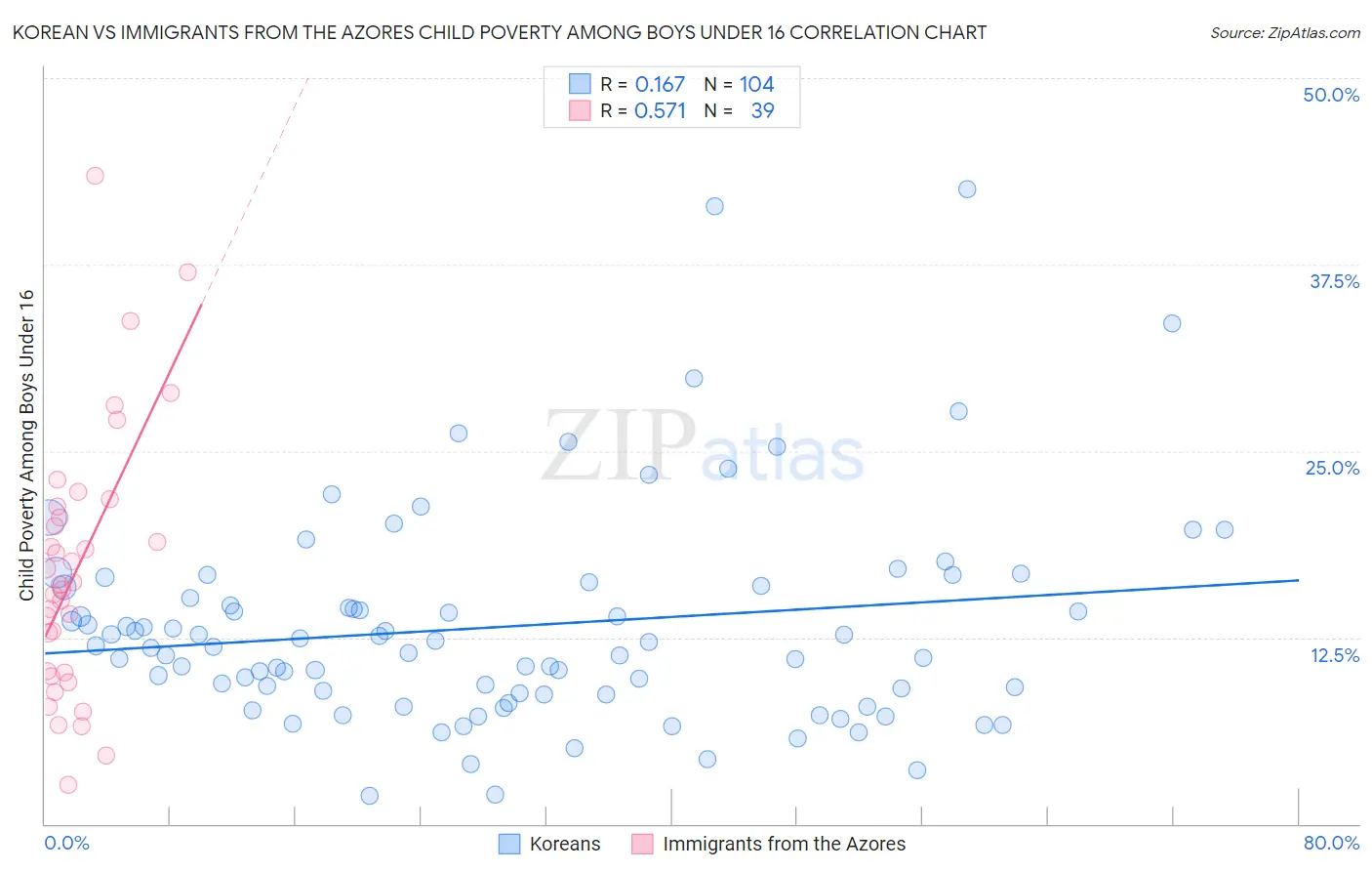 Korean vs Immigrants from the Azores Child Poverty Among Boys Under 16 Correlation Chart