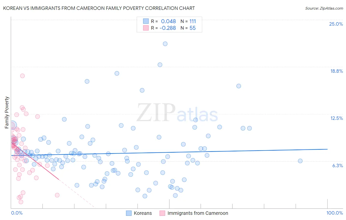 Korean vs Immigrants from Cameroon Family Poverty Correlation Chart