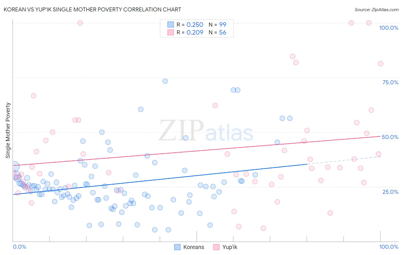 Korean vs Yup'ik Single Mother Poverty Correlation Chart