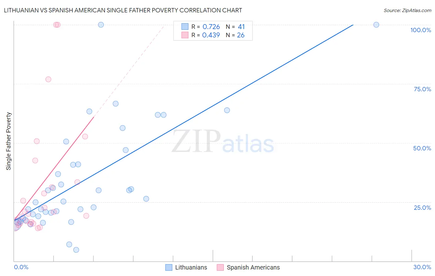 Lithuanian vs Spanish American Single Father Poverty Correlation Chart